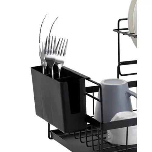 Het robuuste stalen frame met luxe matzwarte coating en antislipvoetjes zorgt voor stabiliteit en duurzaamheid, terwijl de geïntegreerde lekbak en afneembare bestekmand zorgen voor extra gebruiksgemak.