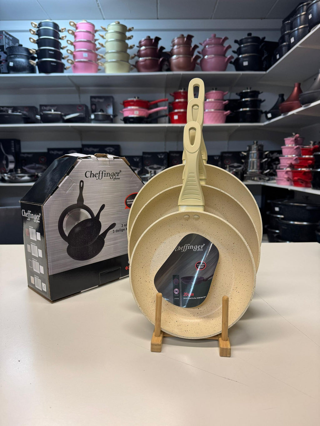 Mit dem 3-teiligen Bratpfannenset von Cheffinger in Beige entscheiden Sie sich für Stil, Qualität und praktischen Komfort im Alltag. Perfekt für alle, die Kochen ernst nehmen und gleichzeitig Wert auf Design legen.