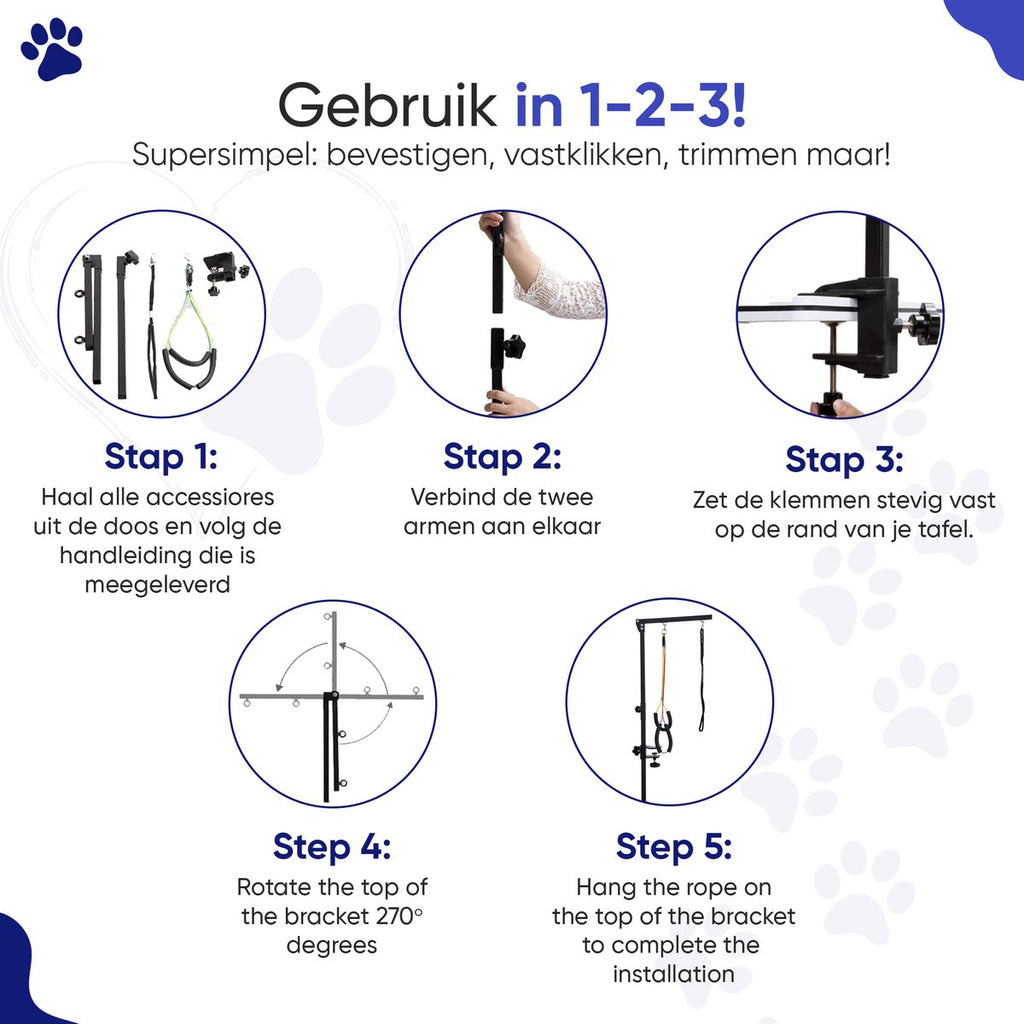 Met de Furley’s Universele Trimarm met Hangmat maak je van elke tafel in een handomdraai een veilige en comfortabele trimsalon. Deze complete trimtafel set is ideaal voor hondeneigenaren en trimmers die hun huisdier professioneel willen verzorgen, zonder gedoe of dure apparatuur. Dankzij het slimme, inklapbare ontwerp is de set perfect voor thuisgebruik én mobiel trimmen.