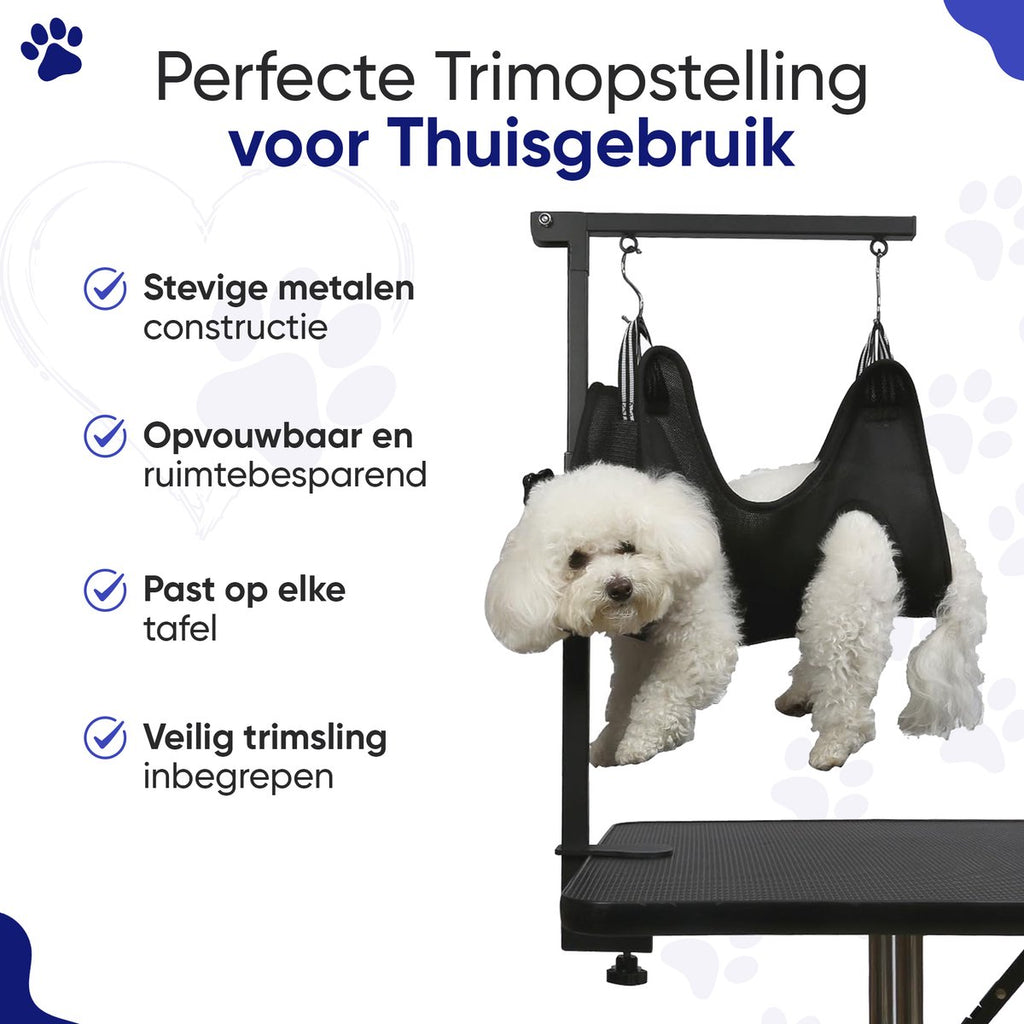 De verstelbare trimarm zorgt voor stabiliteit en controle tijdens het borstelen, knippen of nagels verzorgen. De meegeleverde hangmat biedt extra ondersteuning en veiligheid voor honden in maat S/M en helpt onrustig bewegen te verminderen. Zo kan jouw hond ontspannen blijven, terwijl jij nauwkeurig en stressvrij werkt. Voor grotere honden zijn de bijgeleverde accessoires perfect geschikt, zodat je ook hen volledig kunt verzorgen.