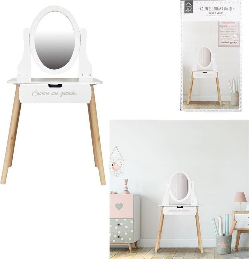 Dieser aus robustem MDF gefertigte Schminktisch mit festem Spiegel vereint Stil und Langlebigkeit. Dank seiner kinderfreundlichen Höhe von 109 cm ist er ideal für kleine Kinder. Ein charmantes Möbelstück, das nicht nur schön aussieht, sondern auch die Fantasie anregt.