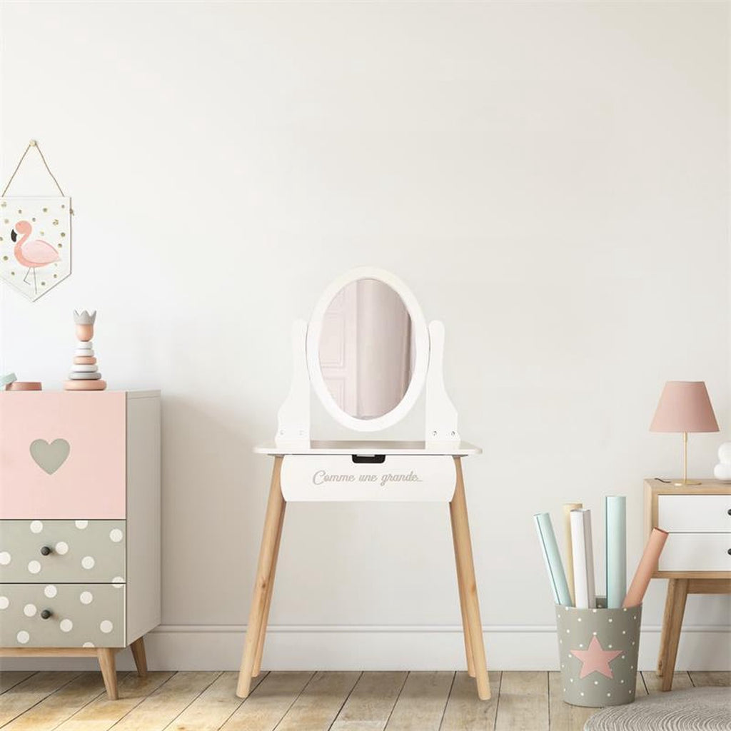 Mit diesem Schminktisch aus Holz für Mädchen werden Träume wahr – eine bezaubernde Ergänzung für jedes Kinderzimmer. Dank seines eleganten Designs, des festen Spiegels und der verspielten Details ist dieser Schminktisch perfekt für kleine Prinzessinnen, die gerne so tun, als würden sie sich für einen königlichen Ball fertigmachen. Vom Schminken bis zum fantasievollen Spielen bietet dieser Schminktisch unzählige Möglichkeiten.