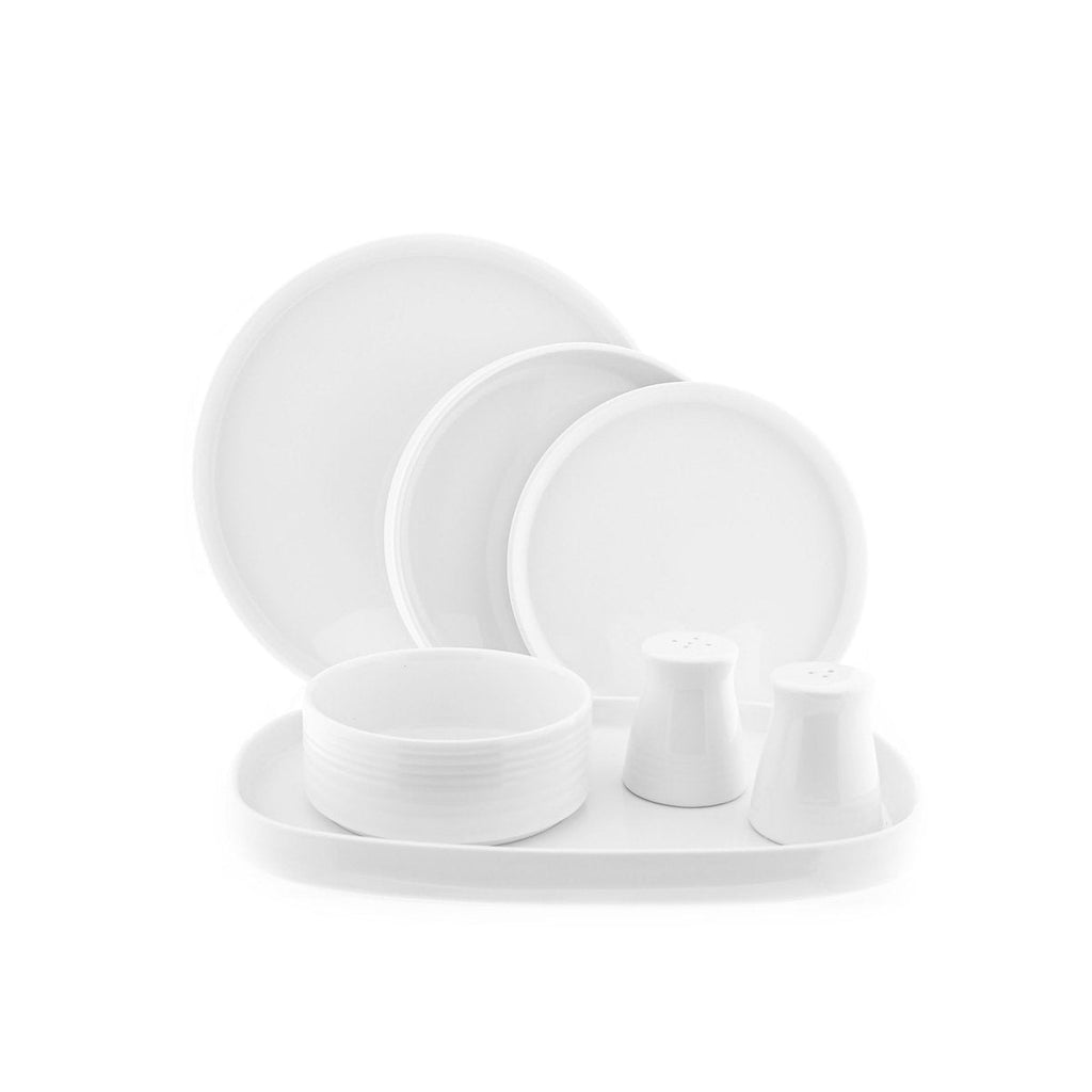- Contents: 6 dinner plates, 6 deep plates, 6 breakfast plates, 6 bowls, 1 serving dish, 1 salt and pepper set (2-piece)