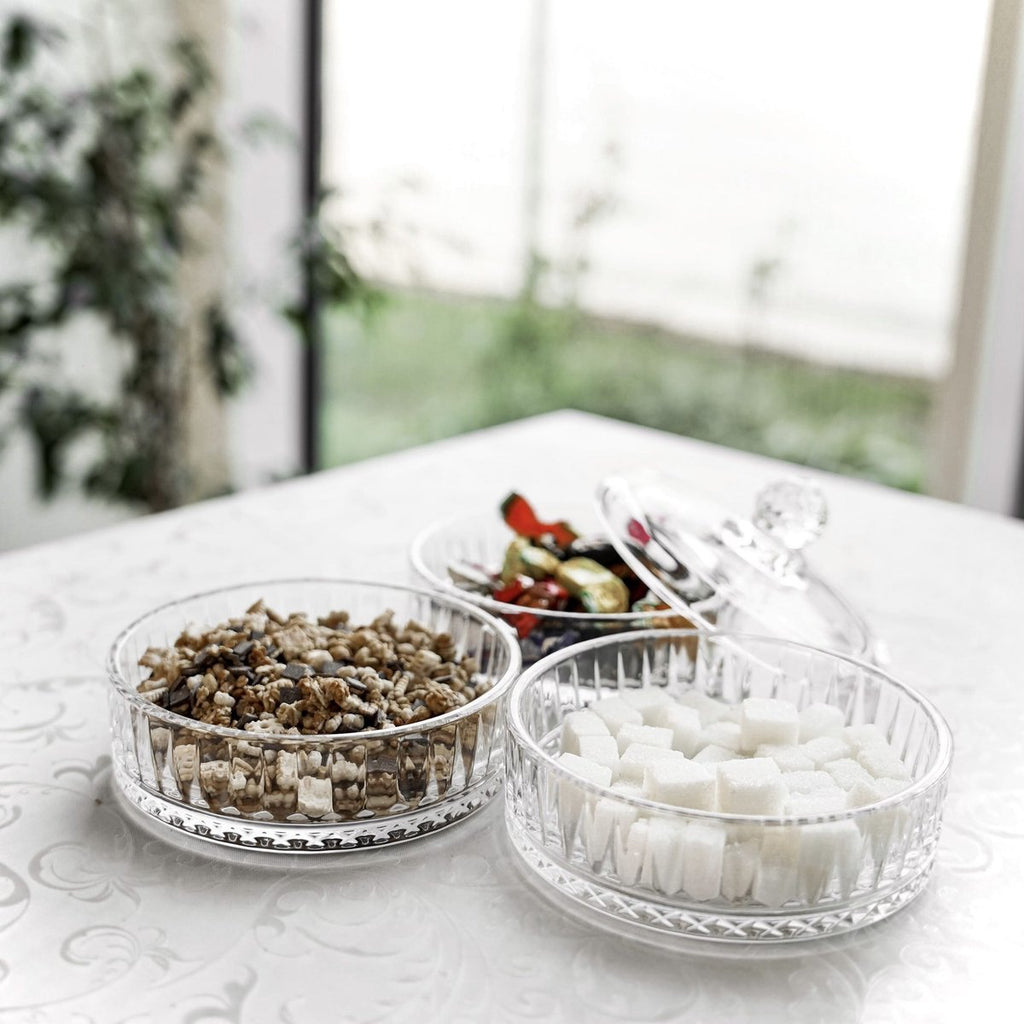 This elegant 3-tiered glass bonbonniere from Almina Elisa A true eye-catcher in any interior. Perfect for stylishly presenting sweets, cookies, nuts, or other treats, it's also ideal for storing small accessories in the bathroom or on a vanity. The transparent glass lets you see what's inside at a glance, while the sturdy lid keeps the contents fresh. A multifunctional showpiece that combines classic charm with modern functionality.