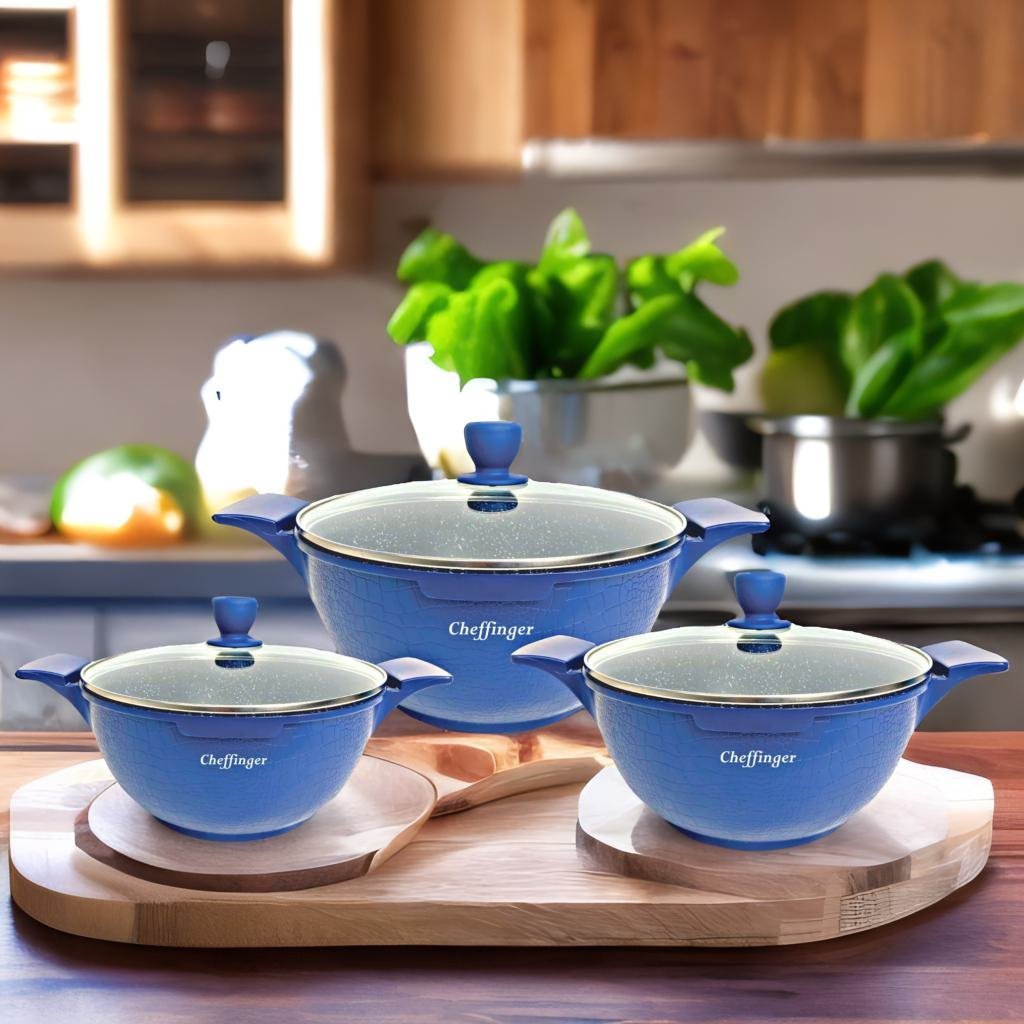 Let your culinary skills shine with the Cheffinger Crocodile Line Pan Set – Blue . This stylish 6-piece set combines luxurious design with ultimate ease of use. The unique crocodile texture and glossy blue finish give your kitchen a modern look, while the high-quality materials ensure perfect cooking results, time after time. With three different pan sizes (20, 24, and 28 cm) including glass lids, you'll have the right pan for every dish at your fingertips.