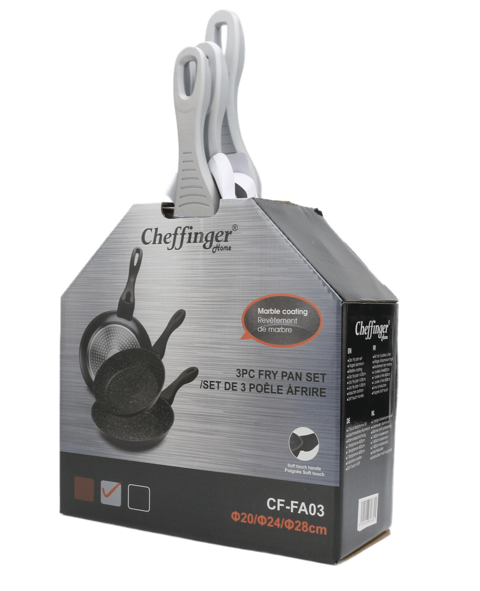 Bring style, convenience, and versatility to your kitchen with the Cheffinger 3-Piece Frying Pan Set with Marble Coating. This set includes three pans in sizes 20, 24, and 28 cm – ideal for everything from a quick egg fry to a more elaborate dinner party. Thanks to the durable, non-stick marble coating, you can cook with minimal fat without sacrificing flavor, and every dish slides effortlessly out of the pan.