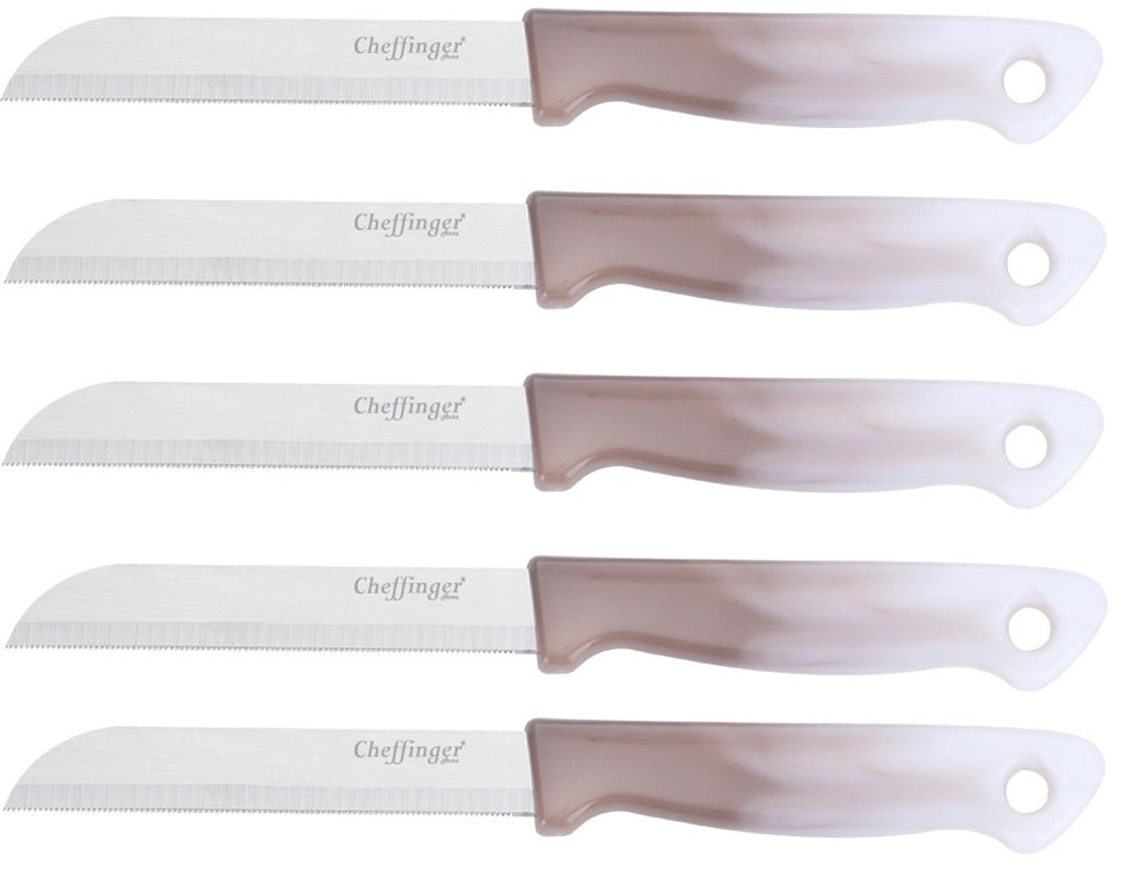 Add style and convenience to your kitchen with the Cheffinger 5-Piece Paring Knife Set in Brown . This set contains five identical paring knives with a total length of 18 cm, perfect for peeling and slicing vegetables, fruit, and other small ingredients. The razor-sharp, smooth-edged stainless steel blades ensure effortless and precise slicing, while the brown handles provide a classic and elegant look combined with a comfortable grip.