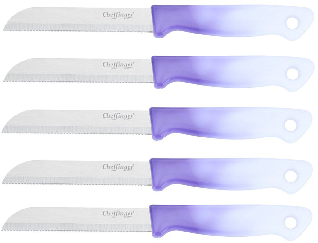 Add a touch of color and elegance to your kitchen with the Cheffinger 5-Piece Paring Knife Set in Lilac . This set contains five identical paring knives with a total length of 18 cm, perfect for peeling and slicing vegetables, fruits, and other small ingredients. The razor-sharp, smooth-edged stainless steel blades ensure effortless and precise slicing, while the lilac handles provide a modern, fresh look and comfortable grip.