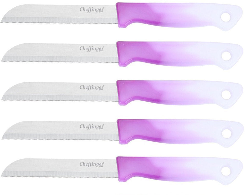 Add a touch of color and practicality to your kitchen with the Cheffinger 5-piece purple paring knife set . This set contains five identical paring knives with a total length of 18 cm, ideal for peeling and slicing vegetables, fruit, and small items. The razor-sharp, smooth-edged stainless steel blades ensure effortless and precise slicing, while the purple handles provide a comfortable grip and a stylish look.