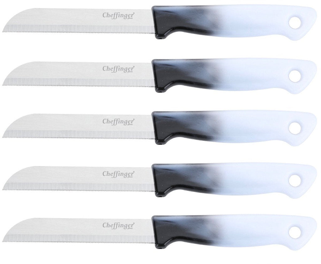 Complete your kitchen with the Cheffinger 5-piece black paring knife set . This set includes five identical paring knives with a total length of 18 cm, ideal for peeling and slicing vegetables, fruit, and other small items. The sharp, smooth-edged stainless steel blades ensure effortless and precise slicing, while the black handles provide a timeless, professional look and a secure grip.
