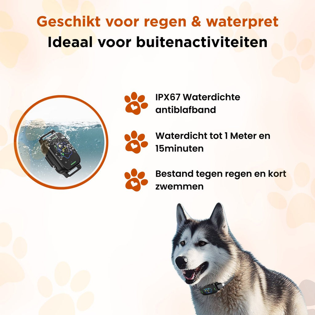 De band is volledig waterdicht (IPX7) en daardoor geschikt voor regen, modder en dagelijkse wandelingen. Met de verstelbare halsband tot 70 cm is hij comfortabel te dragen voor honden vanaf circa 10 kg. De oplaadbare USB-C batterij gaat tot wel 20 uur mee en dankzij de automatische pauzefunctie wordt overstimulatie voorkomen.