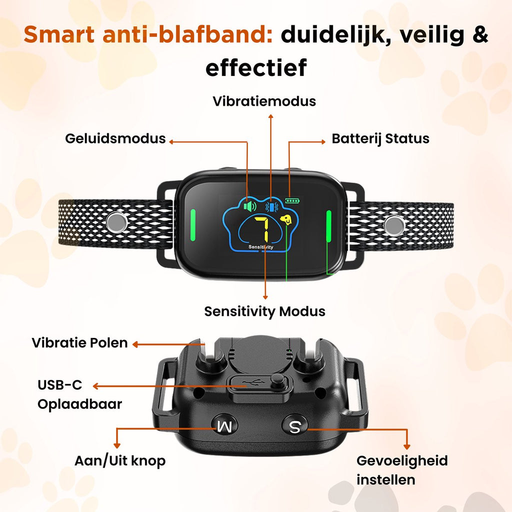 De anti-blafband beschikt over 3 instelbare trainingsmodi: piep, trilling of een combinatie van beide. Dankzij de 7 gevoeligheidsniveaus stem je de reactie nauwkeurig af op het blafgedrag en karakter van jouw hond. Het grote LCD kleurenscherm geeft in één oogopslag inzicht in de actieve modus, gevoeligheid en batterijstatus, wat het gebruik extra eenvoudig maakt.