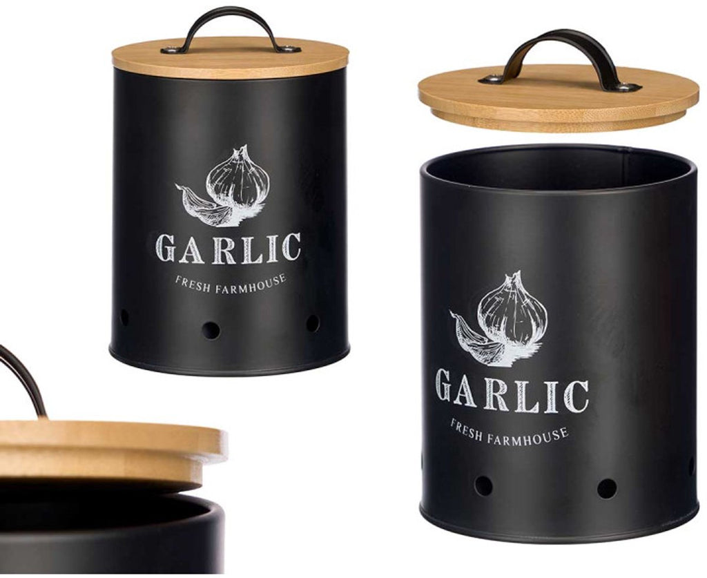 Keep garlic fresh and odor-free for longer with the Kinvara Garlic Jar with Bamboo Lid – Black . This compact and stylish storage jar is specially designed to protect garlic from light and moisture, while the air holes ensure good ventilation. This prevents mold and keeps your cloves firm and aromatic for longer.