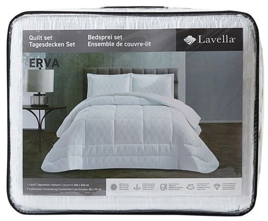 Effortlessly add a touch of elegance to your bedroom with the Lavella Erva 3-Piece Bedspread Set – White . This stylish set combines a luxurious look with practical comfort. The generous 260 x 240 cm bedspread is perfect for double beds and box springs, and is complemented by two elegant pillowcases with decorative piping.
