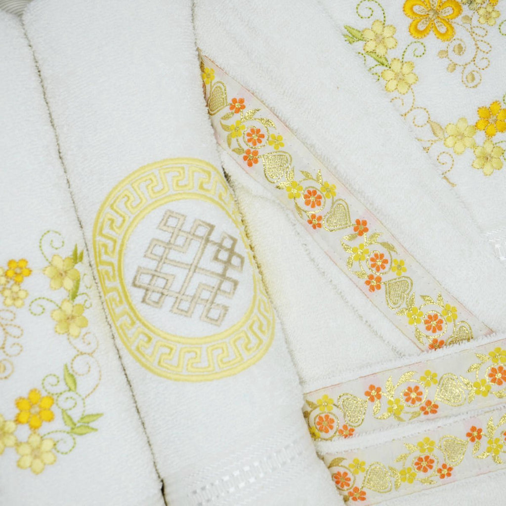 - Contents: 2 bathrobes, 2 large bath towels (70x140 cm), 2 hand towels (50x90 cm), 2 guest towels (30x30 cm), 2 pairs of slippers, 2 scrub sponges and 2 luxury soaps