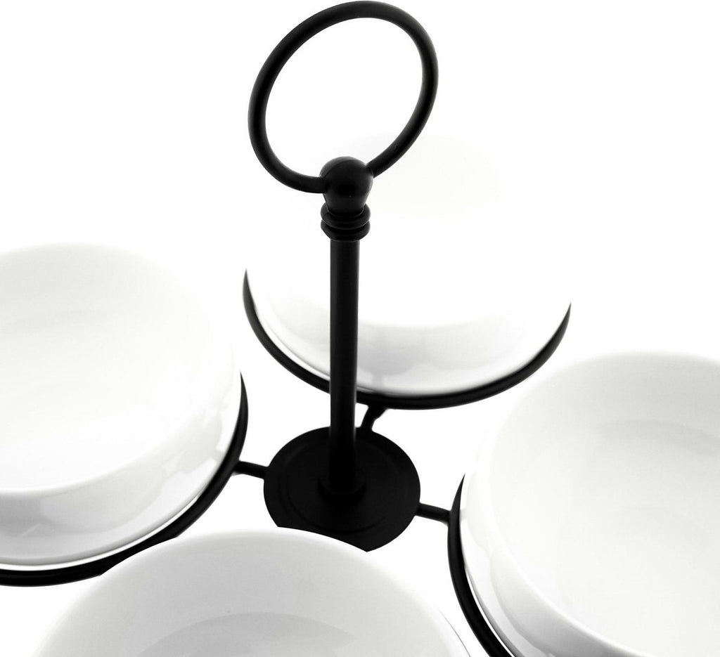 Presenteer je hapjes stijlvol en overzichtelijk met de Almina Belicia snackschalen set – 5-delig. Deze elegante serveerset bestaat uit vier witte porseleinen schaaltjes en een stabiele zwarte standaard, ideaal voor het serveren van dips, noten, fruit, rauwkost of sausjes. Dankzij het tijdloze, moderne design past deze set perfect op elke tafel – van feestjes tot een gezellige borrelavond.