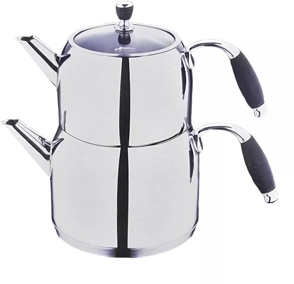 Ontdek de perfecte balans tussen traditie en praktisch gebruik met de Almina Viola theepot set van 0,7L + 1,5L. Deze stijlvolle Turkse theepot is vervaardigd uit hoogwaardig 18/10 edelstaal en biedt een uitstekende warmtegeleiding en langdurige kwaliteit. Dankzij het compacte formaat is deze set ideaal voor dagelijks gebruik, terwijl het elegante ontwerp en de inductiegeschikte bodem zorgen voor veelzijdigheid in elke keuken.