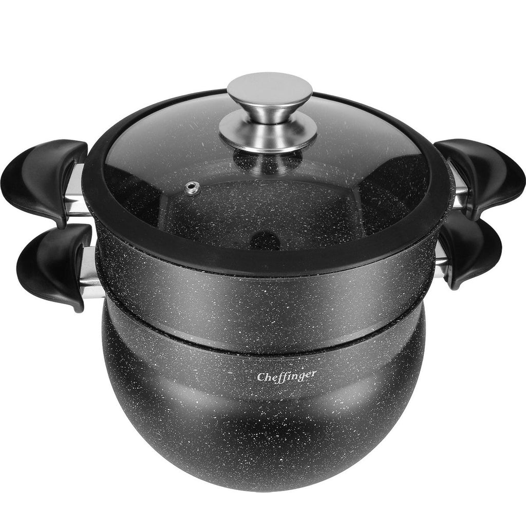 Ervaar gezond, smaakvol en veelzijdig koken met de Cheffinger Couscouspan – 8 liter – Ø24 cm. Deze ruime pan met stoominzet is ideaal voor het bereiden van couscous, maar ook perfect geschikt voor het stomen van groenten, vis, vlees en rijst. Dankzij de hoogwaardige marmeren antiaanbaklaag kook je zonder schadelijke stoffen zoals PFOA en heb je minder vet nodig – gezonder én gemakkelijker. De robuuste aluminium constructie met hittebestendige coating staat garant voor jarenlang kookplezier.