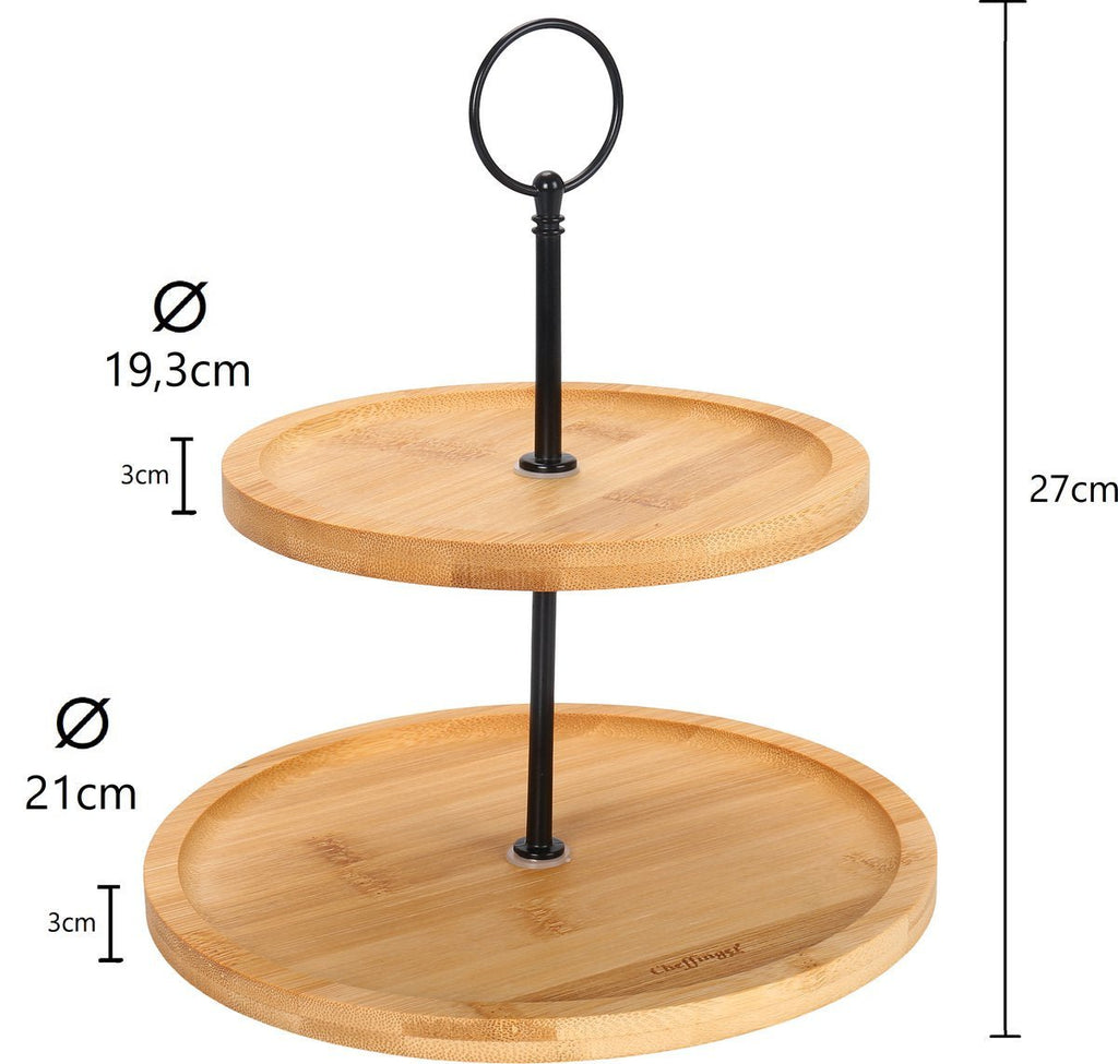 Geef jouw hapjes en lekkernijen een stijlvolle presentatie met de Cheffinger 2-laagse etagère van bamboe. Of je nu kaas, vers fruit, kleine gebakjes of snacks wilt serveren, deze etagère maakt van elk gerecht een eyecatcher. Dankzij de moderne combinatie van warm bamboe en strak metaal past hij perfect in iedere keuken of op elk feestelijk buffet. Ideaal voor feestjes, gezellige avonden of gewoon als decoratief element op tafel.