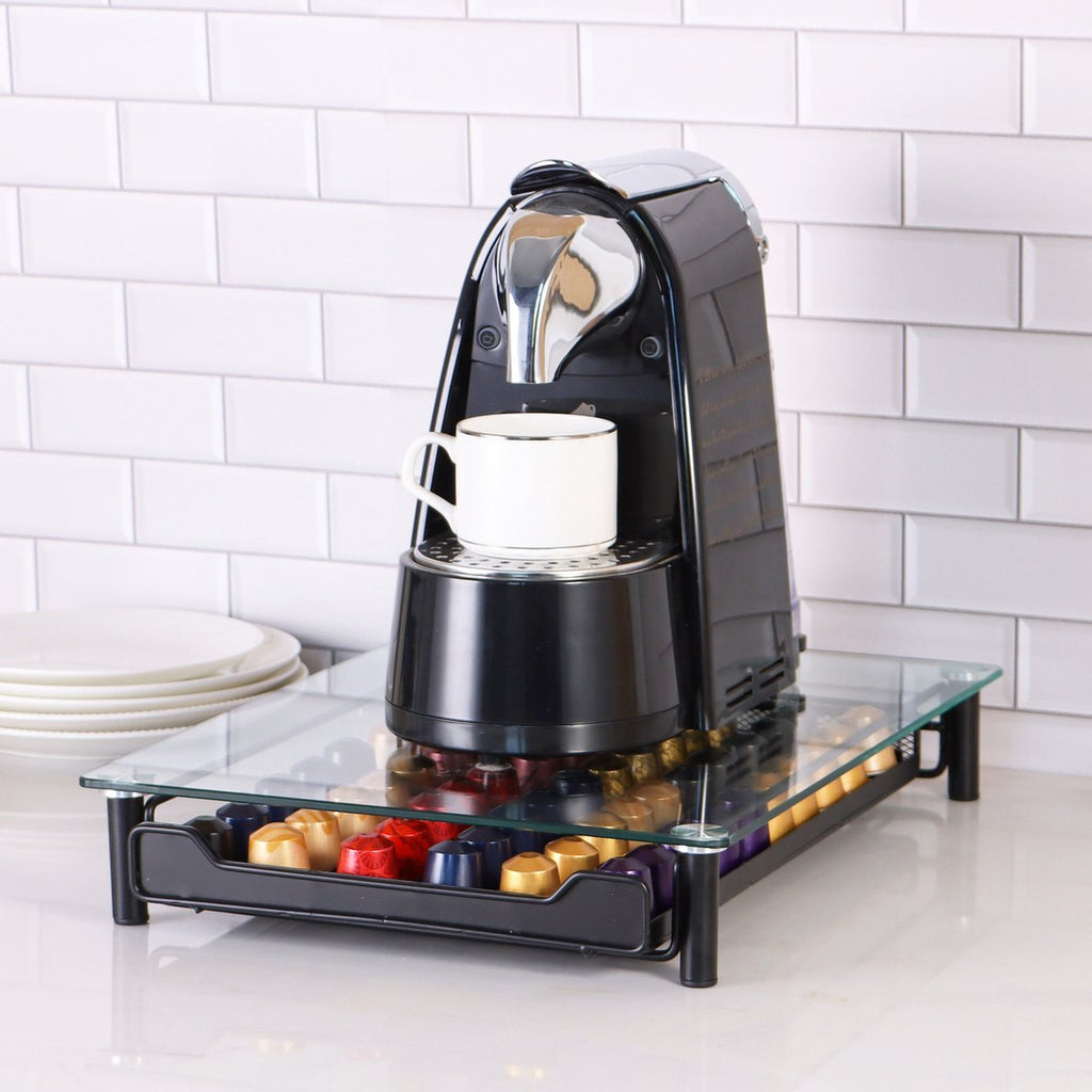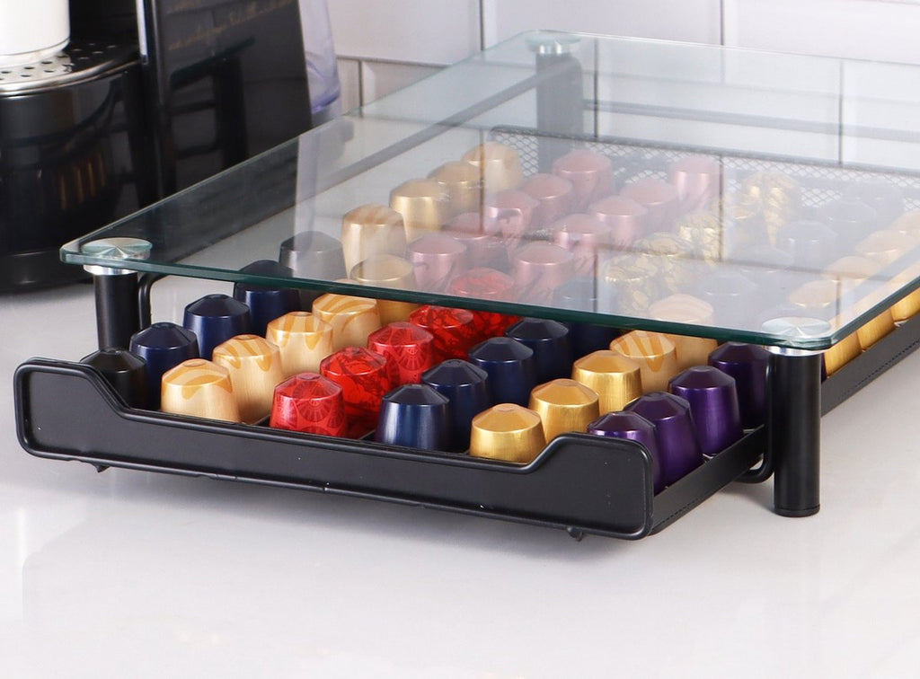 Breng orde én elegantie in jouw koffieroutine met de Nespresso glazen capsulehouder van Cheffinger. Deze stijlvolle ladehouder biedt ruimte aan maar liefst 60 Nespresso-capsules, zodat je jouw favoriete smaken overzichtelijk kunt organiseren en altijd bij de hand hebt. Dankzij het moderne ontwerp met een transparant glazen bovendek zie je in één oogopslag welke capsules op voorraad zijn – ideaal voor een vlotte start van je dag.