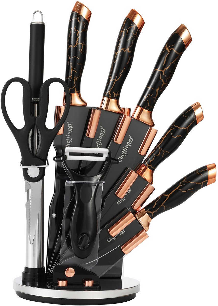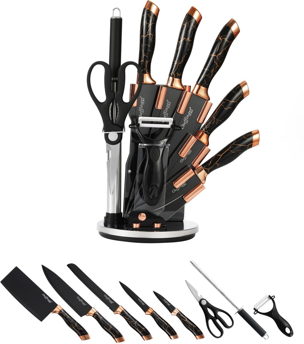 Voeg luxe en functionaliteit toe aan je keuken met deze 9-delige messenset in een chique zwart-marmere design met gouden accenten. Deze set is niet alleen een blikvanger, maar ook dé tool voor elke kookliefhebber die houdt van kwaliteit, precisie en stijl. Of je nu groenten snijdt, brood snijdt of vlees hakt – met deze set heb je voor elke taak het juiste mes in handen. De messen zijn gemaakt van robuust, roestvrij staal en zijn eenvoudig schoon te maken. De stijlvolle, draaibare messenstandaard zorgt ervoor dat je jouw messen altijd overzichtelijk en hygiënisch kunt opbergen.