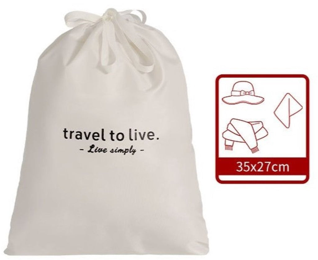 - Setinhoud: 2 kledingtassen (groot & klein), 1 ondergoedtas, 1 toilettas, 1 digitale/cosmeticatas, 1 trekkoordtasje, 1 schoenentas