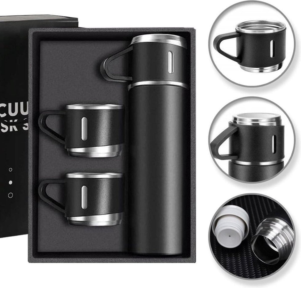 - Meegeleverd: 1 thermosfles, 3 bekers met handgreep, luxe verpakking en geschenkzak