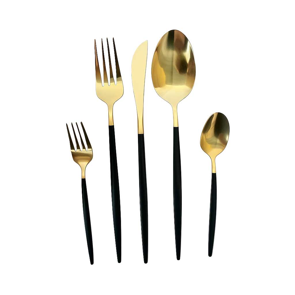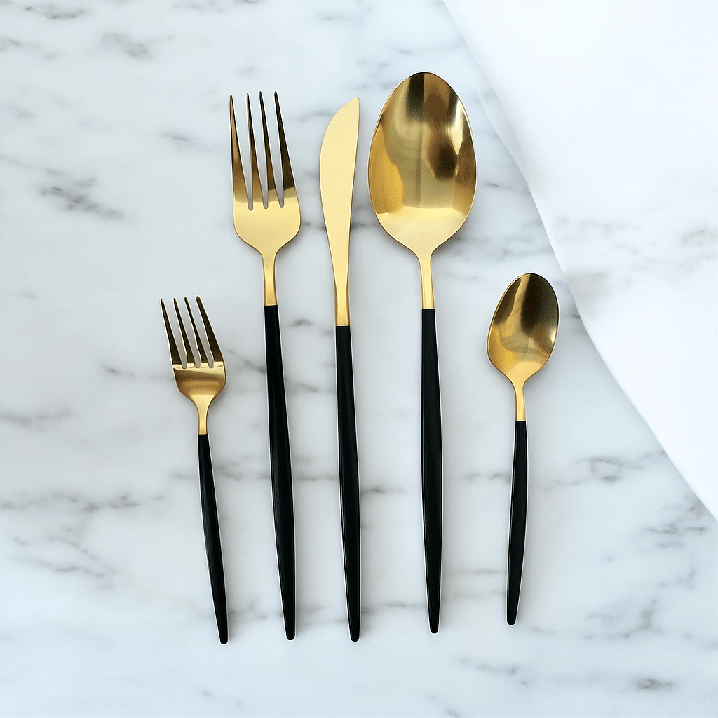 Voeg een vleugje stijl toe aan je eetmomenten en geniet van een luxueuze eetervaring met de Kadirelli Goud/Zwarte Bestekset – een prachtig cadeau voor bijzondere gelegenheden!