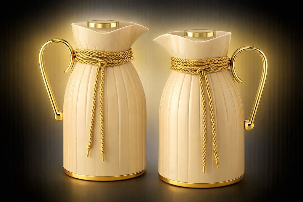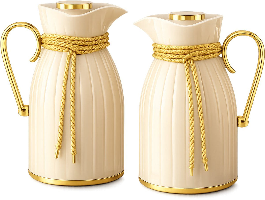 Geef je tafel een warme, elegante uitstraling met de Kadirelli Thermoskan set van 2 in beige en goud. Deze stijlvolle thermoskannen combineren een zachte, neutrale kleur met luxe goudaccenten, waardoor ze moeiteloos passen in elk interieur. Ideaal voor dagelijks gebruik én speciale momenten: van een rustig ontbijt tot een gezellige middag met gasten. Dankzij de hoogwaardige isolatie blijven je dranken langdurig warm of juist heerlijk koel, terwijl het verfijnde design een echte eyecatcher vormt.