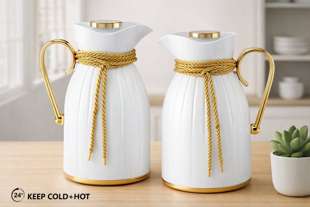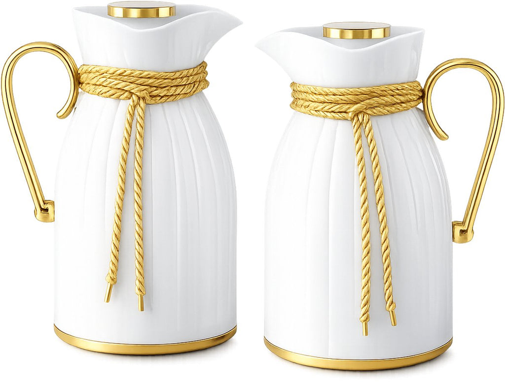 Breng stijl en functionaliteit samen met de Kadirelli Thermoskan set van 2. Deze elegante thermoskannen in wit met luxe goudaccenten zijn niet alleen een blikvanger op tafel, maar houden je dranken ook langdurig op temperatuur. Of je nu koffie serveert tijdens een brunch of thee warm wilt houden voor gasten, met deze set van twee heb je altijd voldoende capaciteit en klasse in huis. De verfijnde afwerking en het unieke design met goudkleurige handgreep en decoratief koord geven een exclusieve uitstraling die perfect past in zowel moderne als klassieke interieurs.