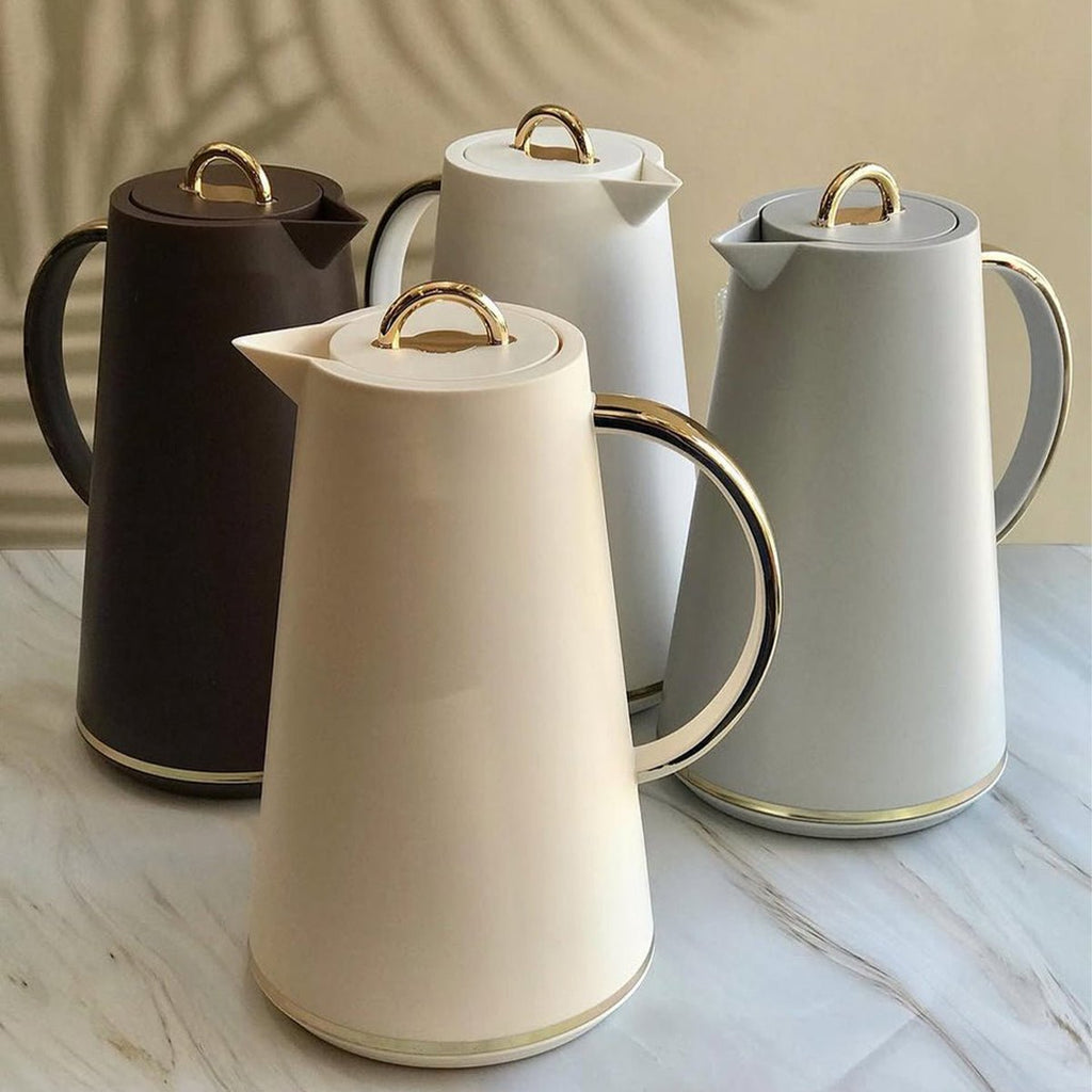 Met de Kadirelli Thermoskan Set Beige/Goud geniet je op elk moment van de dag van jouw favoriete drank in stijl. Betrouwbaar, duurzaam en elegant – een must-have voor elk huishouden of kantoor.