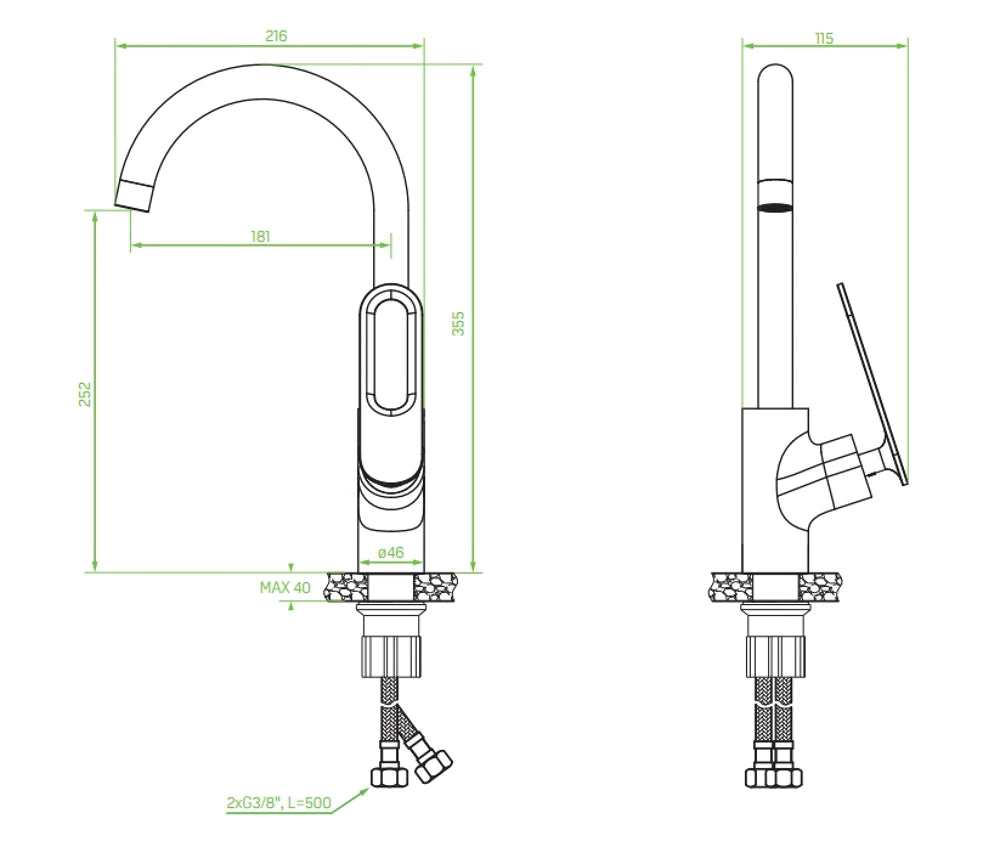 - Hoogte kraan: 355 mm