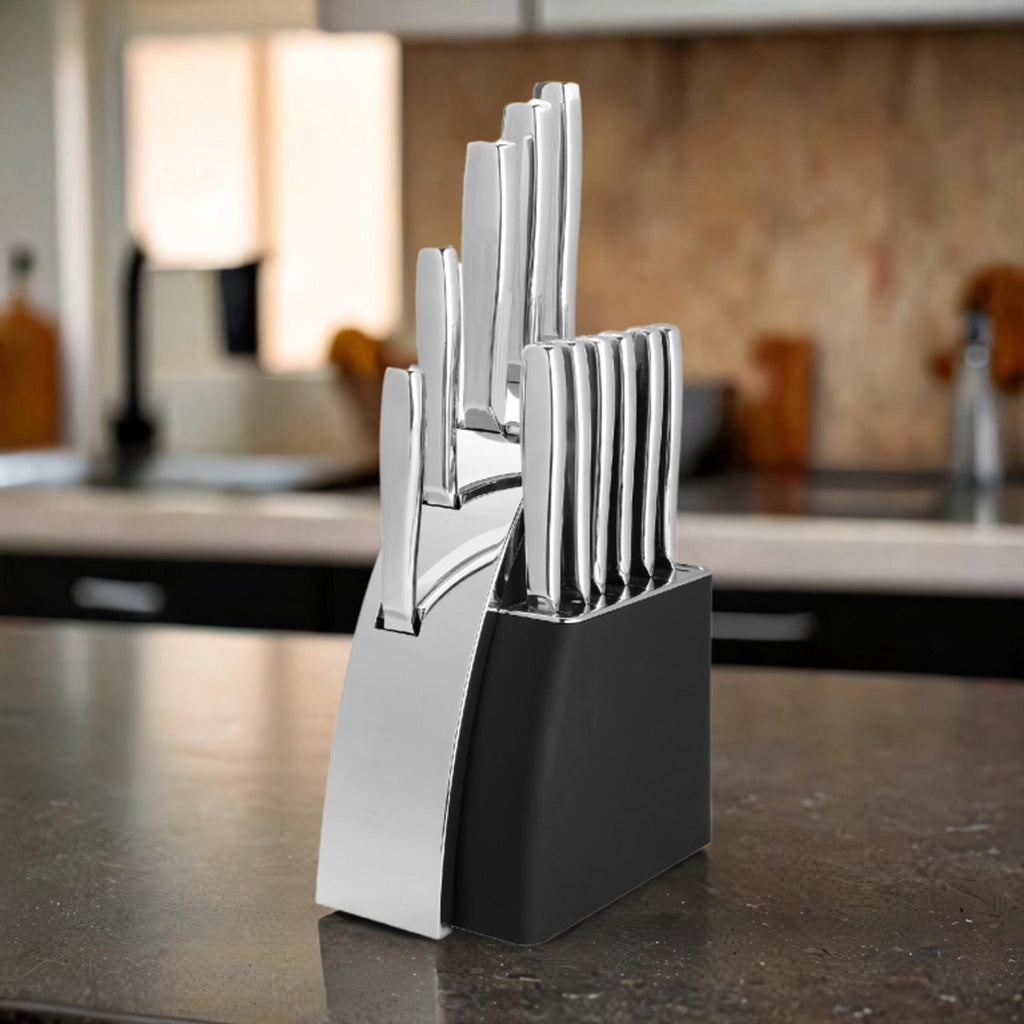 Breng stijl, precisie en topkwaliteit naar je keuken met de Maitre Traiteur 12-delige Messenset met Messenblok. Deze luxe set combineert duurzaamheid, elegantie en vakmanschap, zodat je elke kooktaak met gemak en professionaliteit uitvoert. De messen zijn vervaardigd uit hoogwaardig roestvrij staal, uitzonderlijk scherp en bestand tegen roest en corrosie – perfect voor dagelijks gebruik én culinaire hoogstandjes.