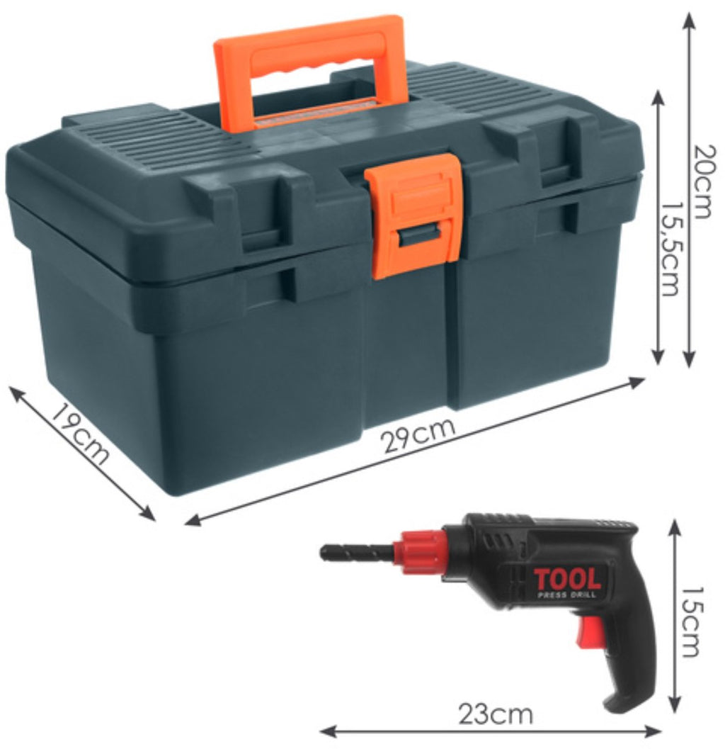 - Aantal onderdelen: 32, waaronder verstelbare sleutel, schuifmaat, handzaag, boormachine